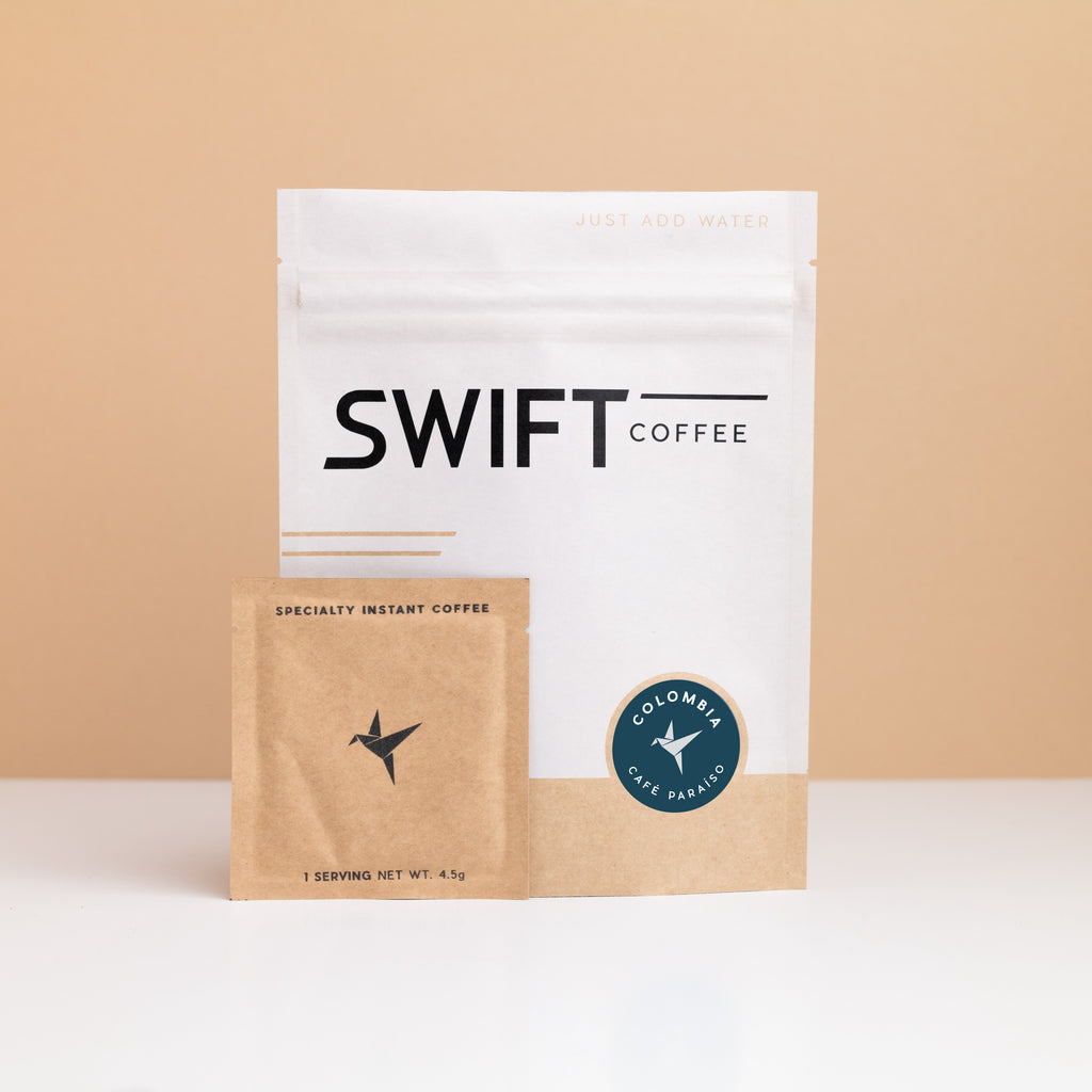 Colombia - Cafe Paraíso is available as an instant coffee in single serve or bulk options. The single serve sachets contain 4.5g (.16oz) of instant coffee and makes a recommended 10oz cup of coffee, just add water! Choose your pack size: 6, 18 or 48 cups.