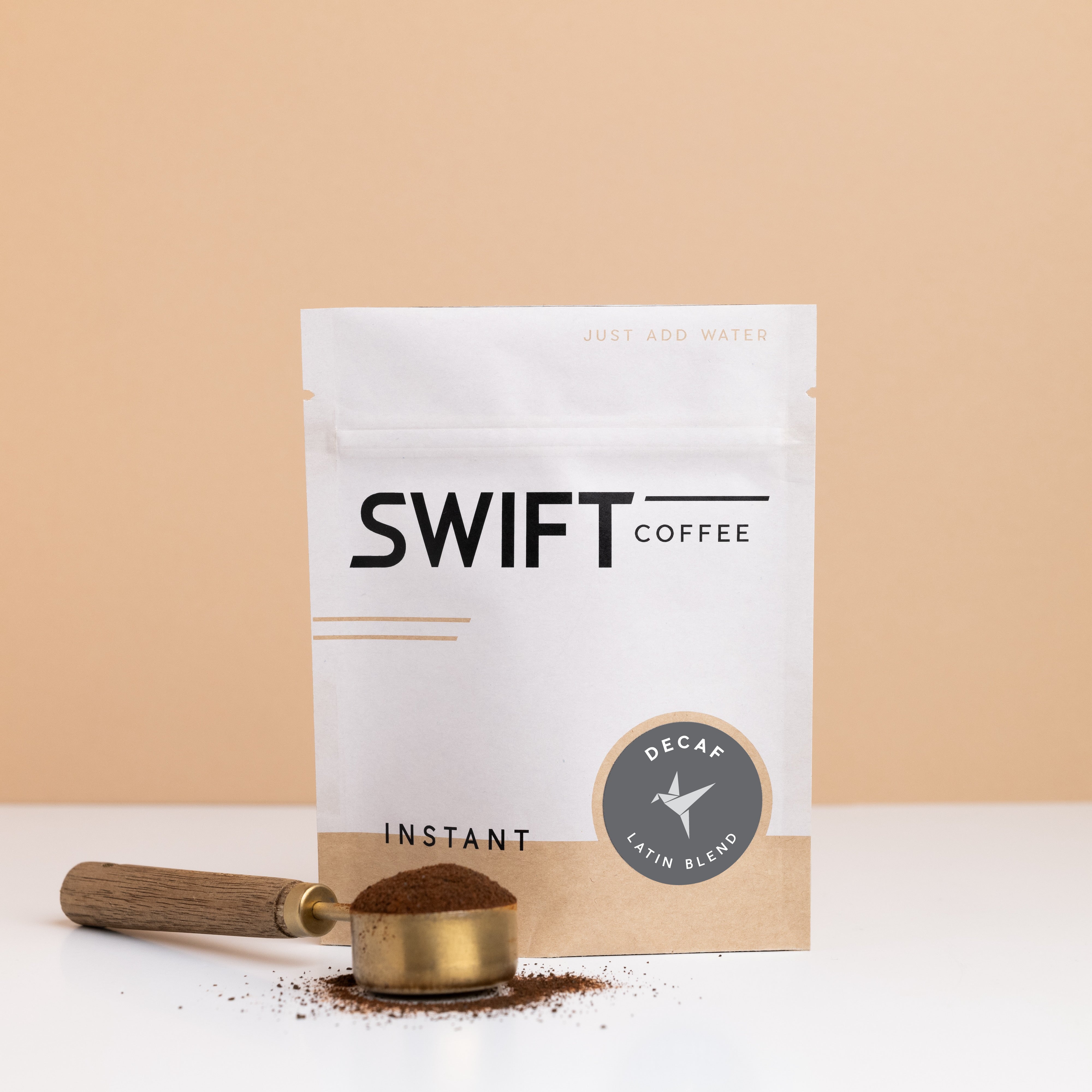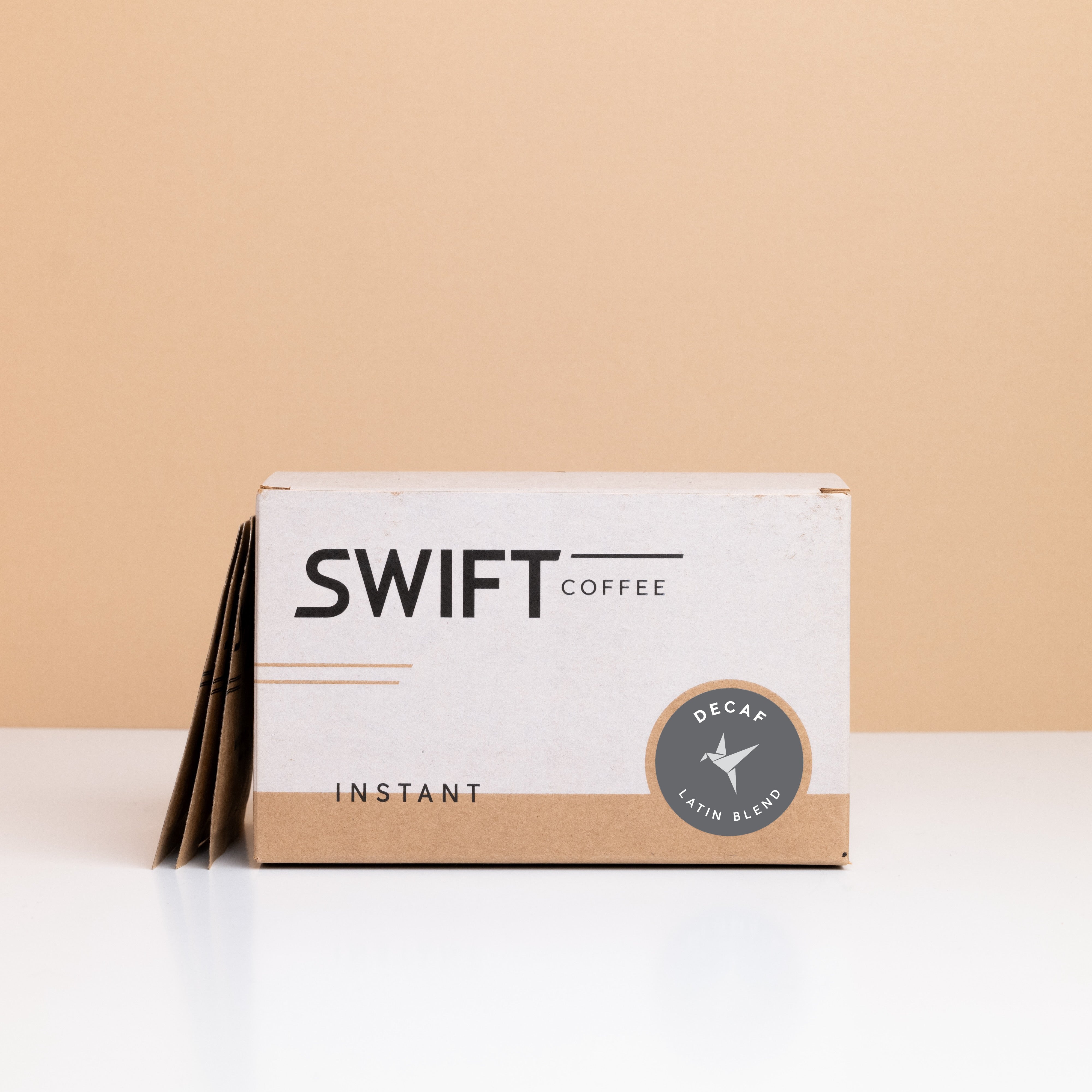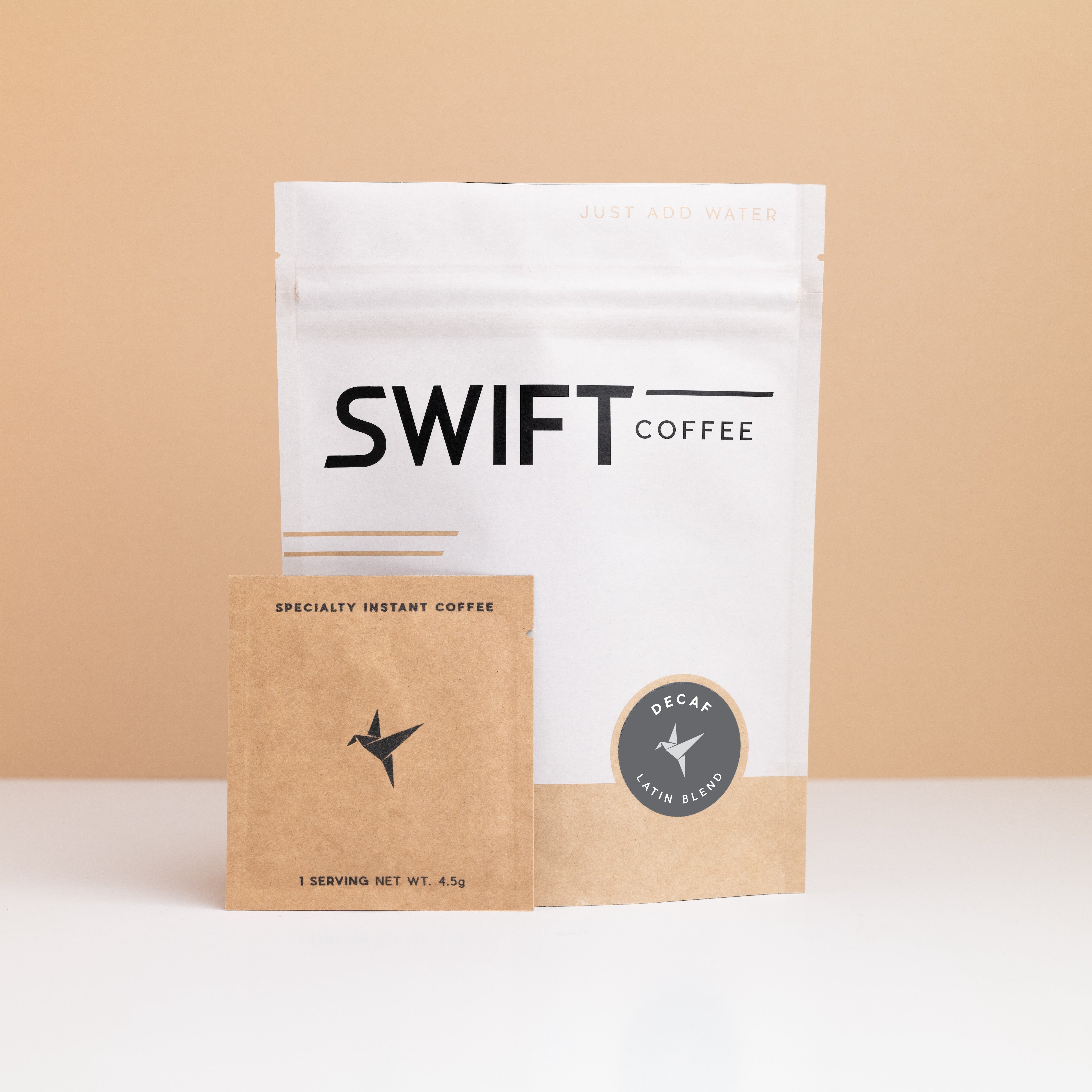 Decaf - Latin Blend is available as an instant coffee in single serve or bulk options. The single serve sachets contain 4.5g (.16oz) of instant coffee and makes a recommended 10oz cup of coffee, just add water! Choose your pack size: 6, 18 or 48 cups.
